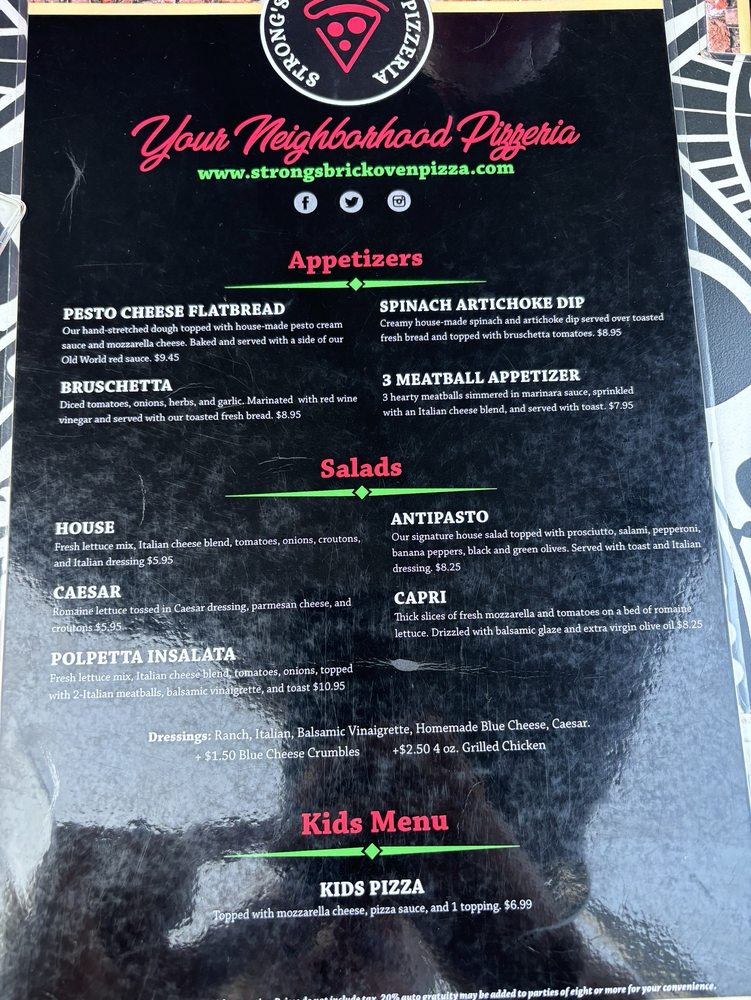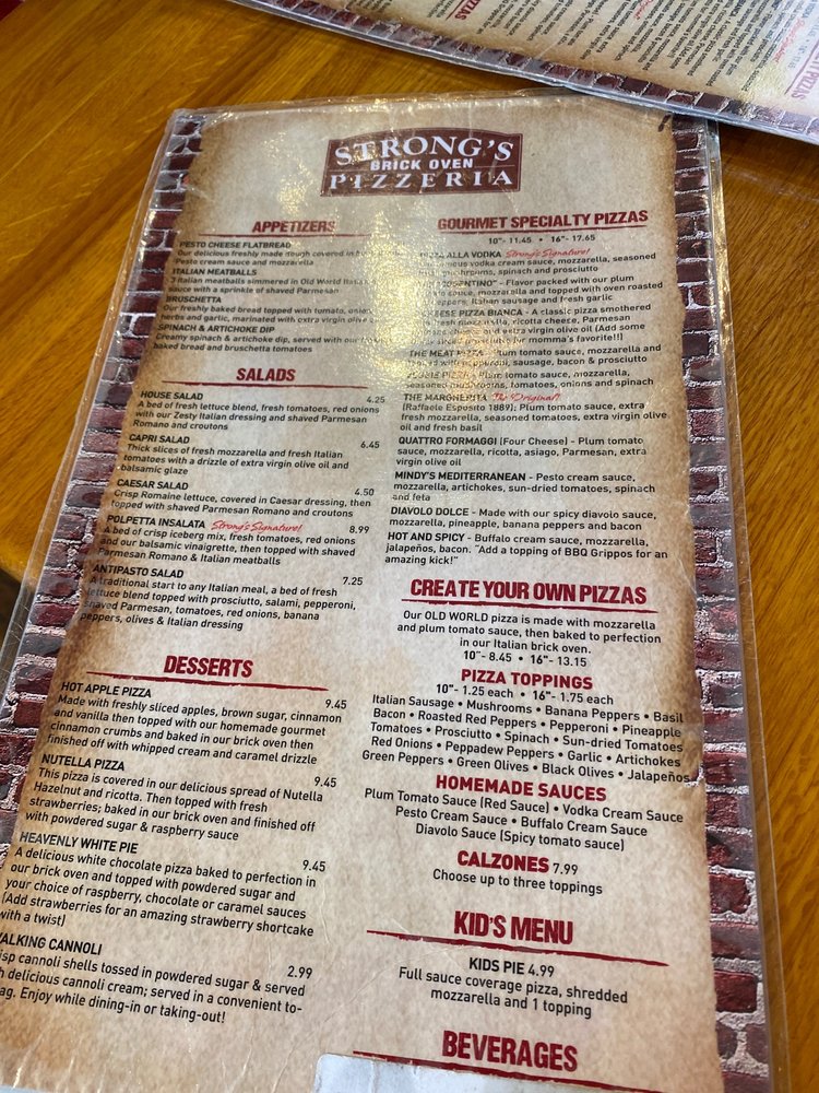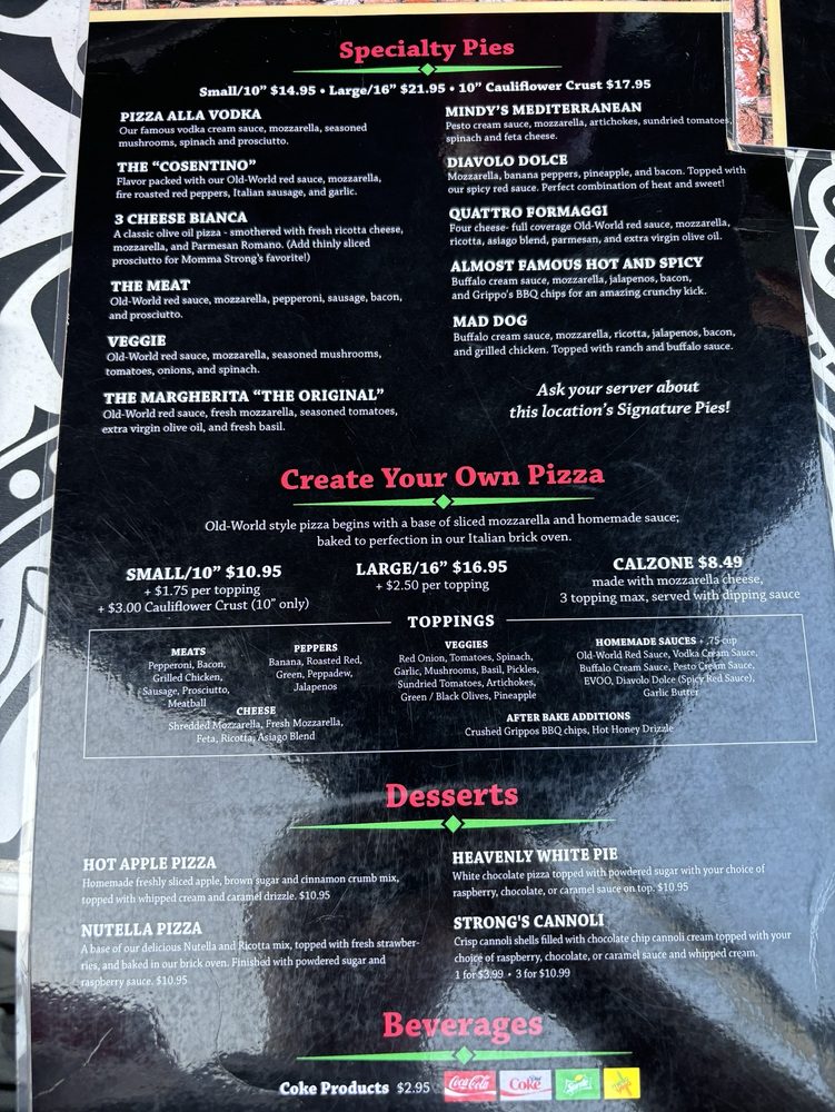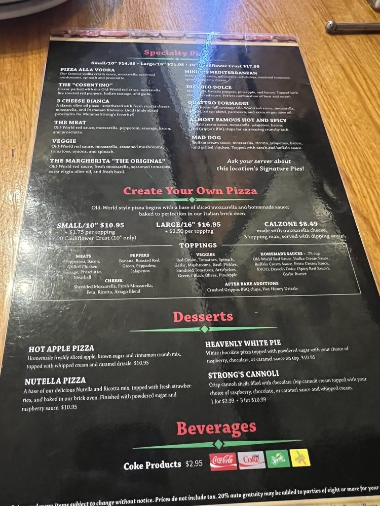 Strong's Brick Oven Pizzeria in Newport, KY is a must-visit for pizza enthusiasts. With a focus on quality ingredients and traditional brick oven cooking, their pizzas are a standout. Customers rave about the perfectly charred crust, rich tomato sauce, and fresh toppings like mozzarella, basil, and sliced tomatoes. The menu also offers a variety of salads and delectable desserts like Nutella pizza. The attention to detail and personal service provided by owners Cindy and Steve create a welcoming and enjoyable dining experience. The cozy ambiance, friendly staff, and delicious food make Strong's Brick Oven Pizzeria a great choice for families and friend groups. Don't miss out on their Quattro Formaggi pizza with pepperonis, a true delight for the taste buds. A visit to Strong's is sure to leave you satisfied and planning your next meal there.